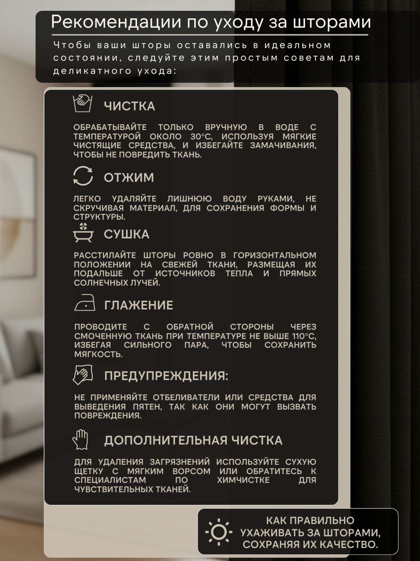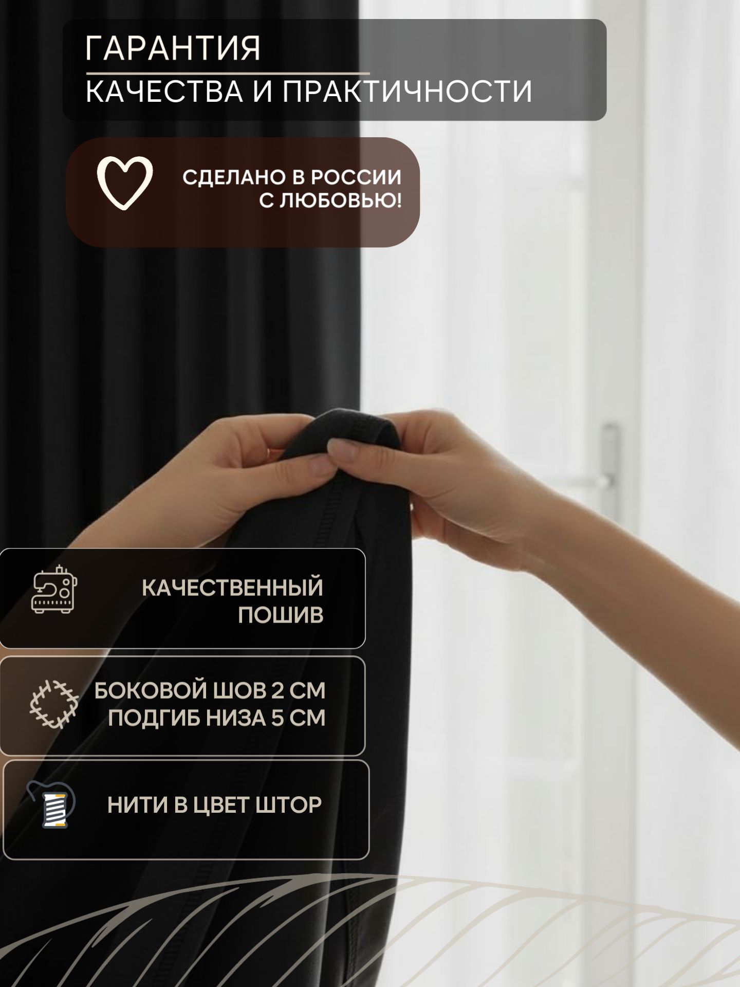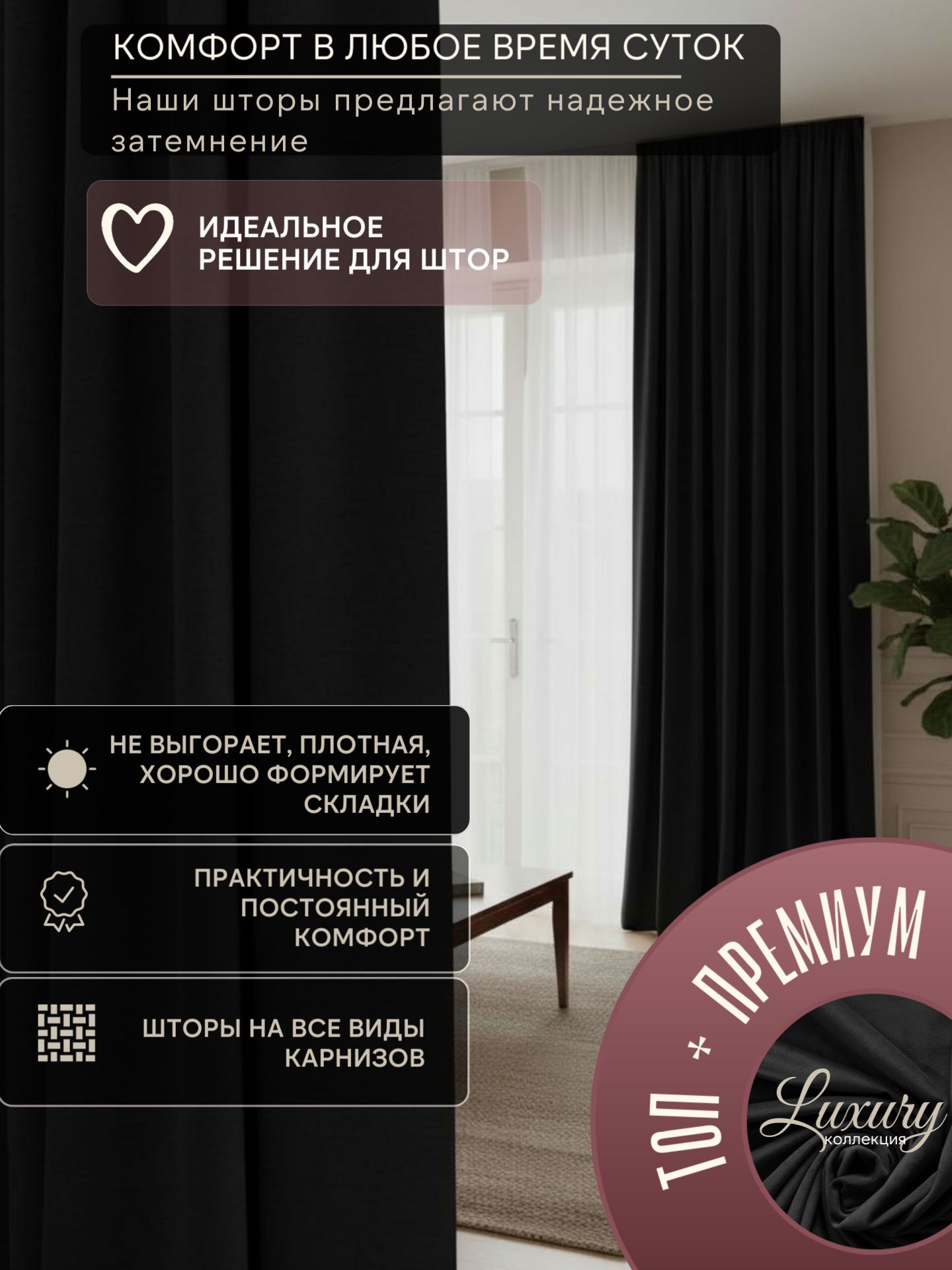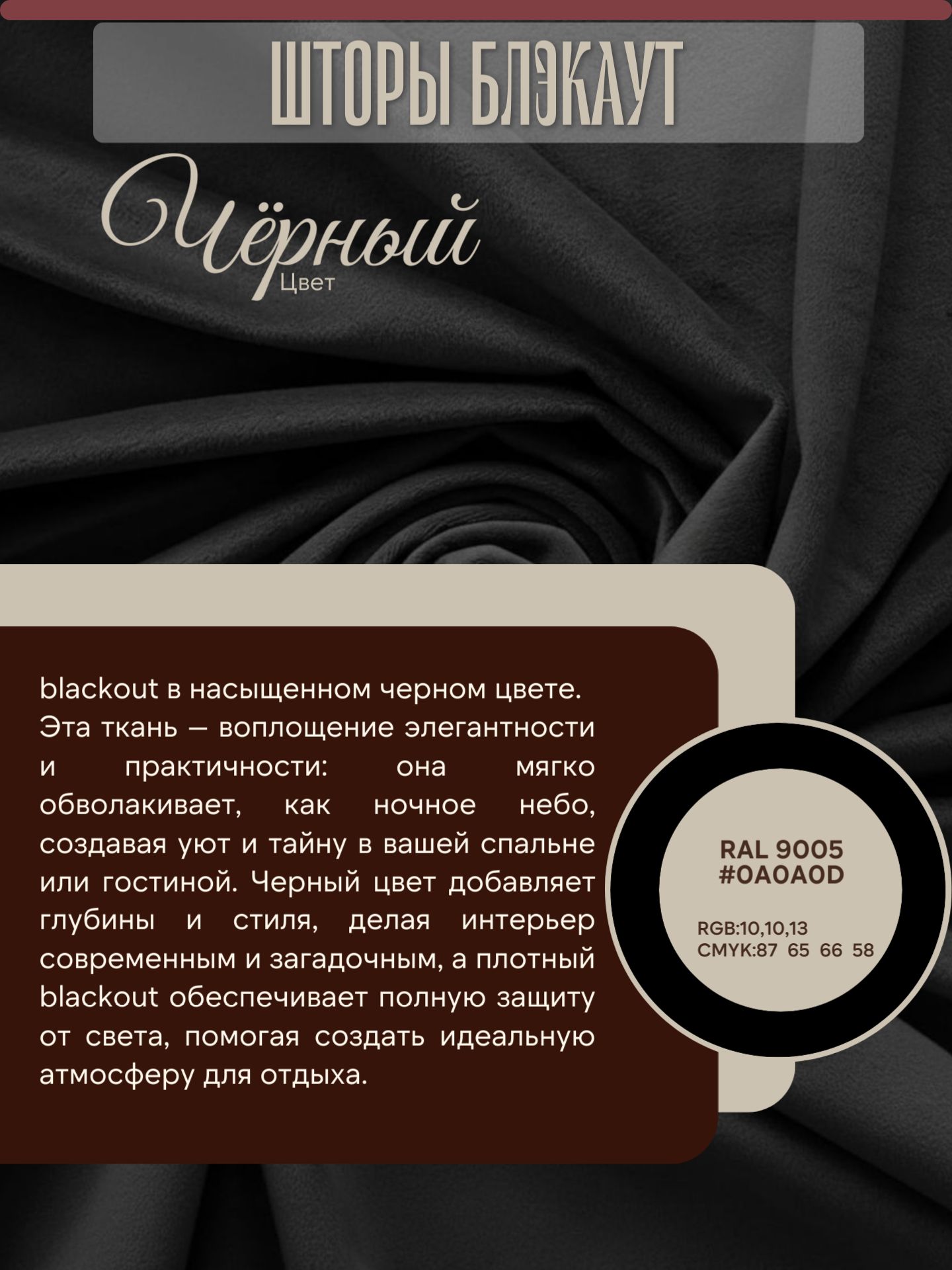 - Материал: Плотный blackout-ткань (полиэстер с покрытием), устойчивая к выцветанию.